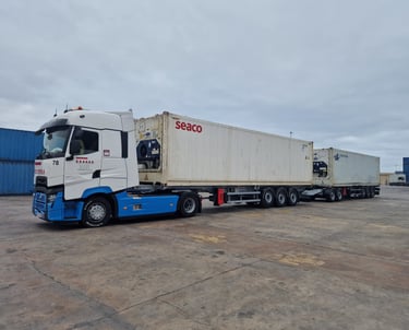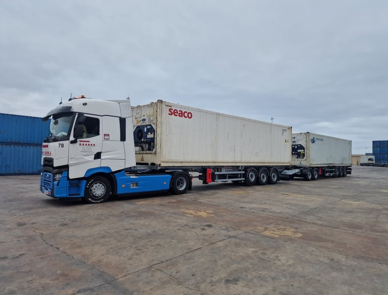 Servicio de transporte frigorífico con dúo tráiler reefer eficiente y seguro, garantizando un control constante de temperatura y máxima protección de mercancías perecederas durante todo el trayecto.